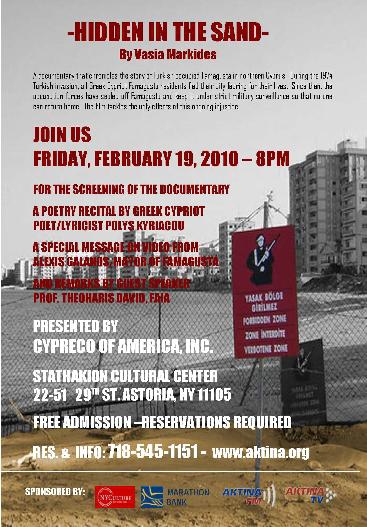 On February 19th 2010 Theoharis David was the guest speaker at a special event dedicated to the coastal city of Famagusta in Cyprus. His lecture titled "Famagusta: Remembrance and Thoughts for its Future" followed a film presentation and poetry recital by other Cypriot artists. The event took place at the Stathakion Cultural Center in Astoria, New York. For more information please visit http://aktina.org/events.html